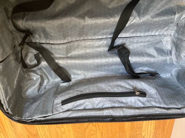 Black soft side wheeled carry on suitcase. $20. 13”w x 8”d x 20”h expands to about 9+”d. One large inner compartment and zippered mesh holder and zippered small pocket. 2 standard outer compartments.