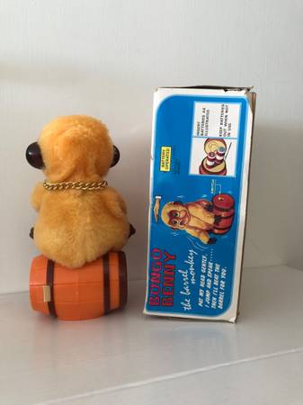 I have a cute BONGO BENNY the Barrel Monkey made in Japan - This item is a Battery-Operated Monkey. He is supposed to have his head patted gently so that he would Jump and Speak and then he'll beat the Barrel for you. I am the original owner and purchased him brand new in operation condition and was used for decoration in our nursery. He went into storage in excellent condition for over 39 years in his original box. I recently took him out of storage to discover he DOESN'T want to operate, even with brand new batteries. So I've decided to SELL FOR ROOM DECORATION in a childs room who loves Monkey's, or to someone who loves to tinker repairing vintage toys as a hobby. I can't understand why he doesn't want to work b/c no batteries were ever left inside while stored.