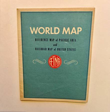 This is a vintage folded WORLD MAP by Aetna Life Insurance. It's produced by Rand McNally and include (in sequence) a railroad map of the United States, a reference map of the Pacific Area, and a map of the world. (3 maps included). The FOLDED size is 7"x5.5" and the UNFOLDED size is 22"x14" Thanks for viewing. (Price Reduced)