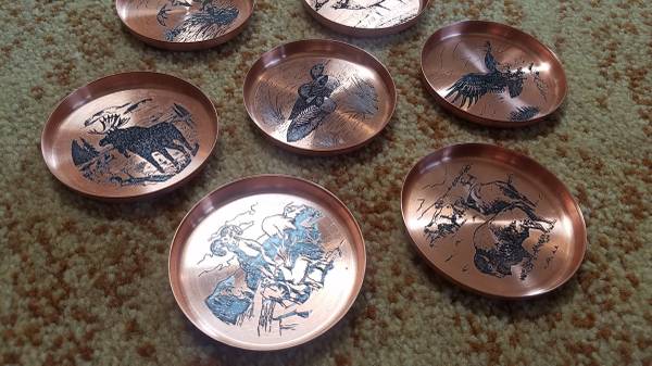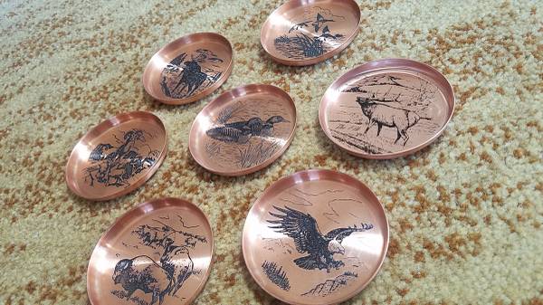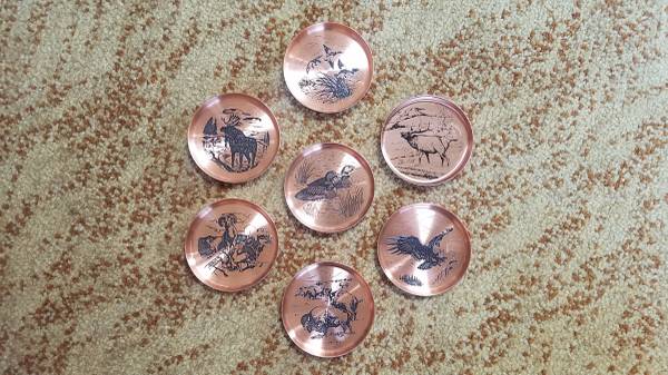 Purchased in the early 90s, this set of 7 copper coasters features various wildlife was purchased in Missoula, Montana. Never used, the set is new still with the tags on. Each measures 3" in...