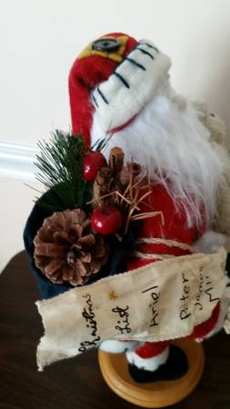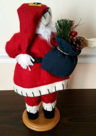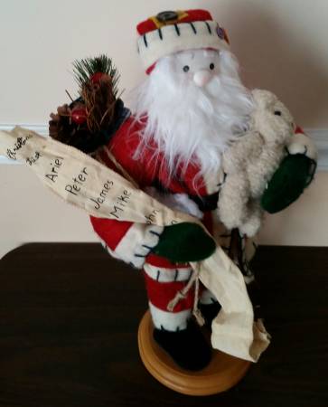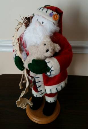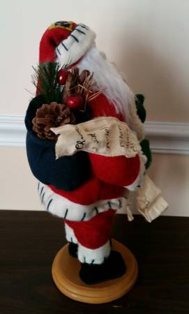 still available - listing will be removed when sold VINTAGE 17" tall old fashioned Santa doll with plush bear, the back sack and list of names on 6" diameter Wooden Base. BRAND NEW MINT CONDITION....