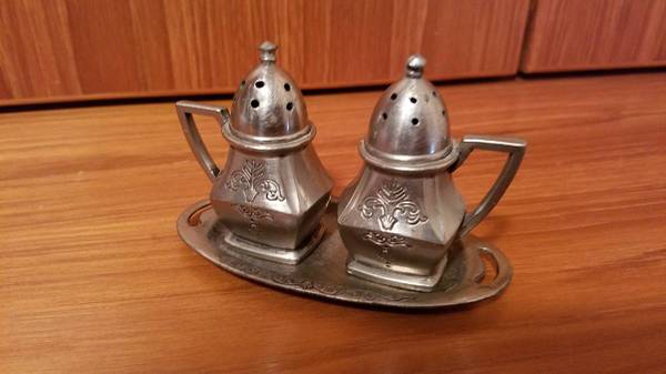 This pair of salt and pepper shakers are pewter and date back at least 50 years if not more. They are engraved with a beautiful design that is replicated on the oval tray on which they sit. Each shaker measures 2.5" tall and just under 2" wide on the side with the handle. See photos for more details.