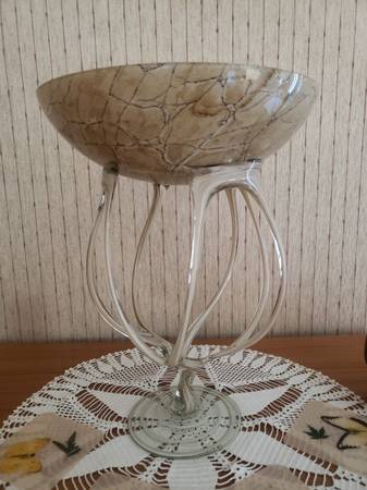 14.5" tall glass sculpture featuring a bowl at the top measuring 11.5" in diameter. The beautifully hanf crafted piece is a stunning focal point of any room.