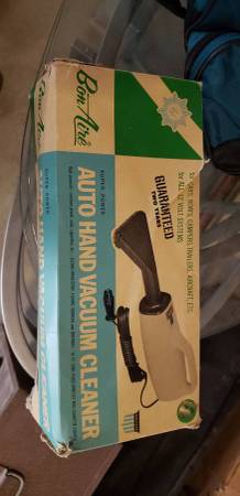 We have a Bon Aire Auto Hand Vacuum Cleaner from the 1970s/80s. It comes in the original box which has some wear but the vacuum inside looks new! Advertised as "High powered - removes gravel, sand, cigarettes, etc." With mention of cigarettes in the car, you know this thing is vintage! See photos for more details and message me if you are interested in meeting to pick it up.