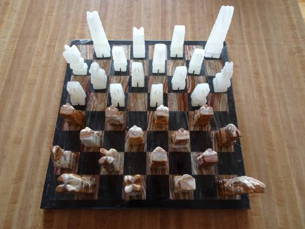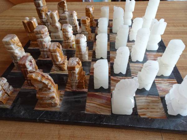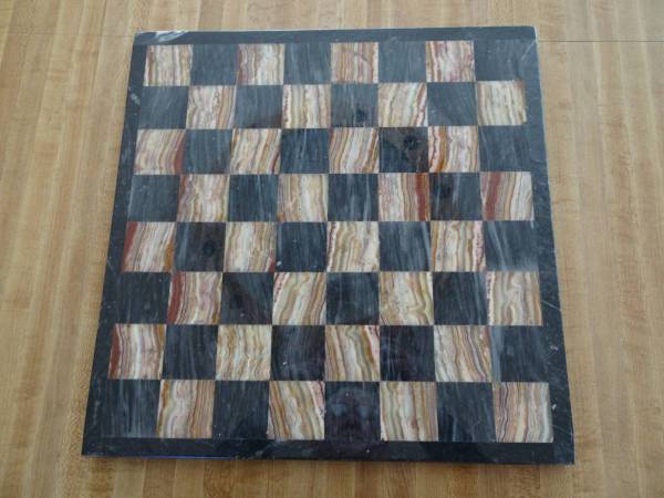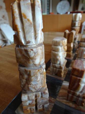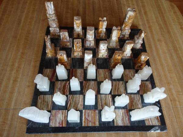 This chess set is handcrafted out of natural stone including alabaster. It measures approximately 16 inches by 16 inches. See photos for more details.