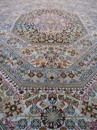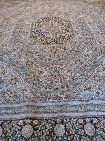 We purchased the rug at auction in 1998 and never used it. It has been stored rolled up in a smoke-free home out of the light and is therefore in pristine condition. Rug consignment stores wanted to list it in their inventory at $9,000 and give us a fraction of that amount when sold. We are therefore trying to sell it now through Craigslist at the price we paid to a great household that is in need of a rug of its size and impressive features. When appraised, we were told this was a Persian rug specifically a Mashhad rug but unfortunately we do not have any paperwork documenting that nor do we have an exact production date.