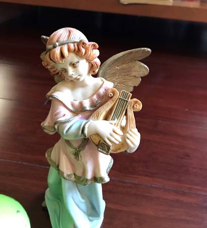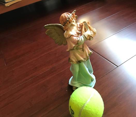 8" pink and blue dress playing a harp gold wings. The picture does not do a good job of showing how metalic the gold looks detailed and intricate hand painted I've placed it next to a tennis ball to...