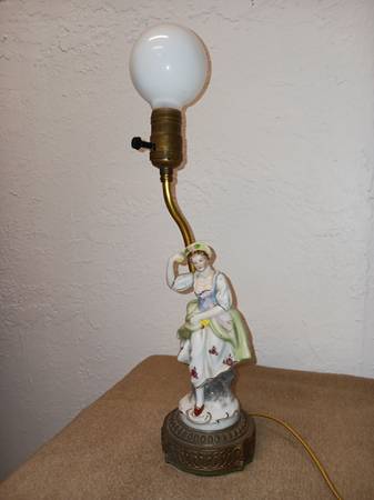 1940s glazed porcelain antique French figure lamp. There are no breaks, no cracks, no chips, and this lamp stands just about 14 inches tall and displays well. It has new felt on the base along with a new plug and cord. $40 cash, thanks for looking. woman cave chick cave French decor shabby chic girls room doll room dollhouse antique porcelain figure lamp German.