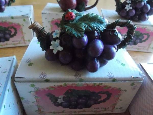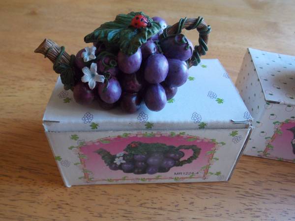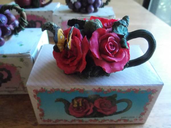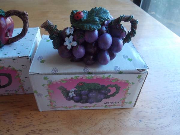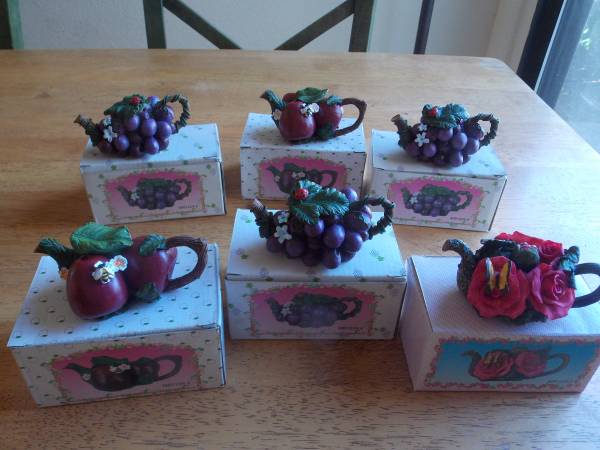 Set of 6 vintage 1997 never used fruit & floral design Tea Pot figurines. Measures about 3 1/2" x 1 3/4". All 6 for $10.