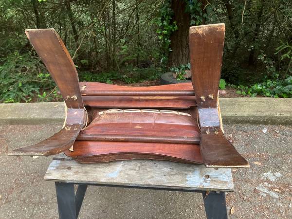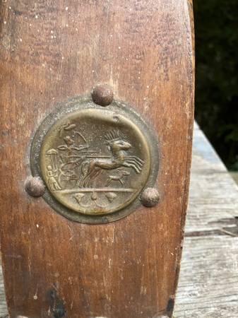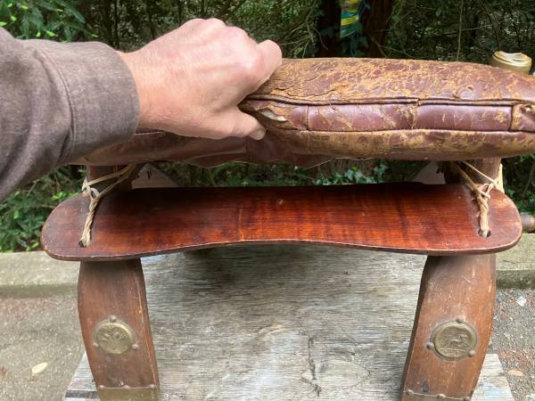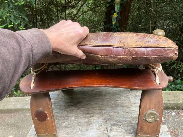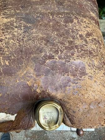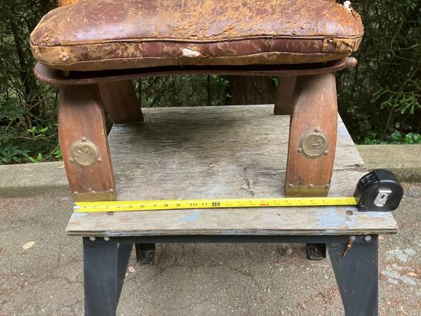 Missing one brass leg medallion. Leather cushion shows considerable wear. Condition as shown in 24 photos.
