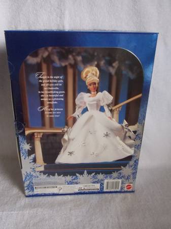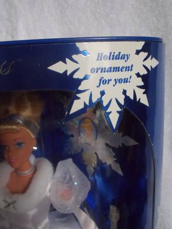 New 1996 Walt Disney's Cinderella Holiday Princess doll with a holiday ornament included in the box. Doll is the size of a Barbie doll. Box has light storage wear.