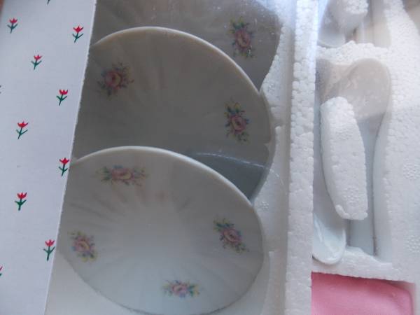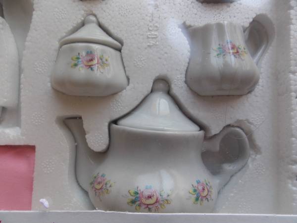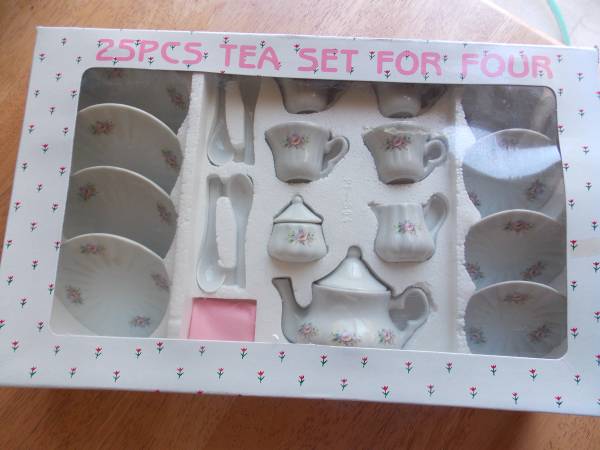 Never used old porcelain children's 25 piece floral tea set for four.