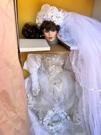 Elegant porcelain bride doll with detailed gown and veil. Collectible item with certificate. New in box.