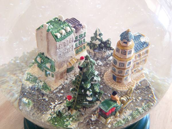 Large and heavy (globe is 6" in diameter, with base 7" tall, 5 pounds in weight) Christmas-themed glass snow globe on green-painted wood base. Placid old-world village scene with two buildings, large tree being trimmed, and a sleigh. White "snow" bits. Music box plays Silver Bells. An absolute vintage beauty, original water still full and clear! Does NOT rotate.