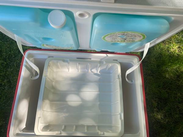 WITH ORIGINAL FOOD TRAY AND WATER JUGS BUILT IN HANDLES AND DRAIN PLUG
