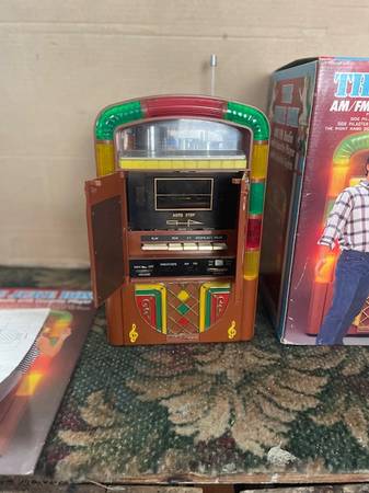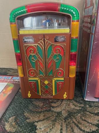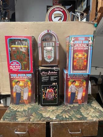 All 5 (new) styled after vintage Jukeboxes from the 1940"s. With original boxes.12" x 7" Battery operated (D size) Circa 1980's , Lights randomly flash when on.