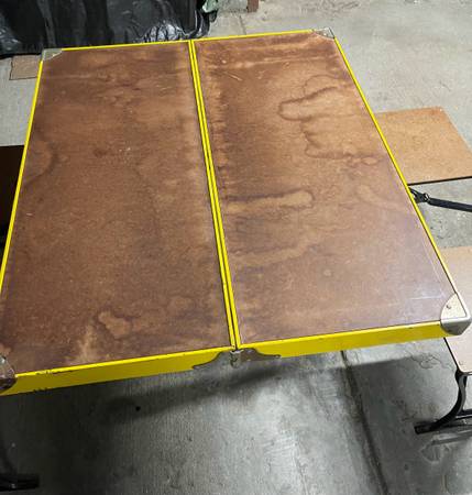 Dates to about 1970’s or so. Excellent working condition just a little cosmetic water damage on top, easily covered with a table cloth. Folded into a cute suitcase form it’s 33” tall, 15” long and about 4.5” wide. Fully opened with seats down it’s 59” wide. When open the table is about 27” from the ground, 33” long, and 29” wide. the seats are 15” inches from the ground, combined 32” long and each seat is 12” wide. All locking parts work easily and close down with a little push from a foot. cash (preferred but no bills larger than 20’s, please). Venmo if needed. Curbside pick-up North San Mateo near ECR/Poplar.******We only reply to inquiries including a phone number.**** Discount for repeat customers : (my roller-skating friends from The City!! - Great for your block parties)