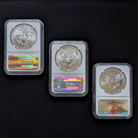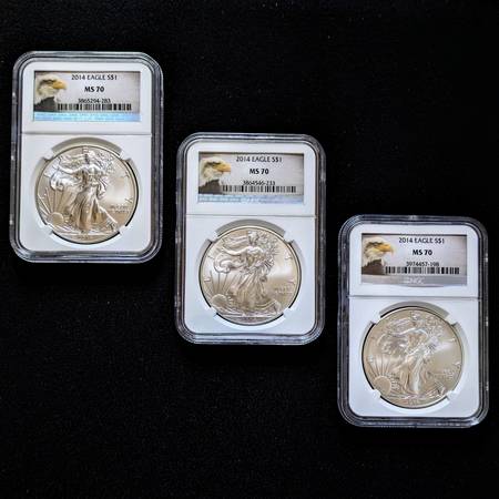 Selling 3 gorgeous uncirculated Silver Eagle One Dollar coins graded a perfect MS 70 by NGC. Slabbed in a hard plastic shell for protection and worry free handling. Made of 1 full troy ounce of fine .999 pure silver. Absolute stunners!