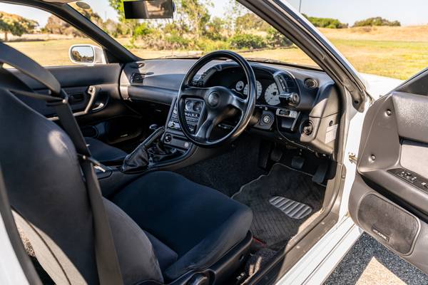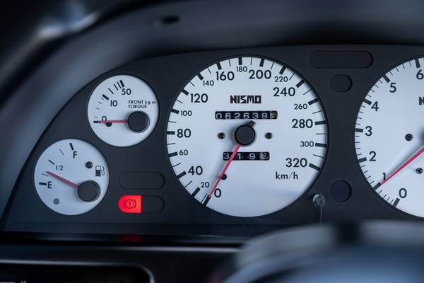 In addition to the awesome twin turbo performance, the Skyline GT-R offered a serious driving environment. As a Japan market car it is right hand drive. The interior features a well instrumented offset cockpit style dash focused on the driver and sporty bolstered twin seats. The gauge cluster is a rare Nismo unit that goes to 320 km/hr. A period correct Japanese-spec Kenwood CD stereo is fitted to the console. Upholstery is fabric and faux suede in deep grey tones. The rear seat offers twin bucket positions and there is a practically sized trunk.