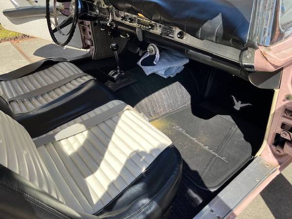 Dusk Rose paint, hard top, power seats (white with black trim), original AM radio, fender skirts
