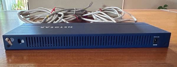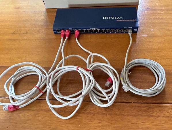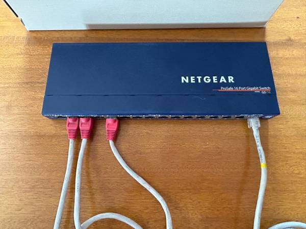 Netgea Prosafe 16 Port Gigabit Switch including electrical plug, 3 cables and ethernet cable.