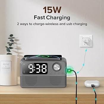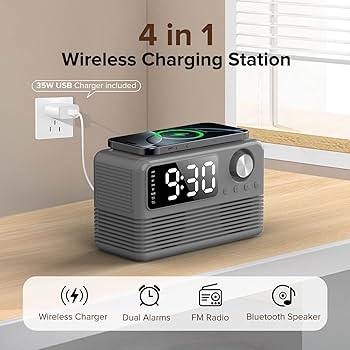 All-in-One for Your Bedside: This multifunctional Digital Alarm Clock combines an alarm clock with dual alarms,wireless charging station,10W Bluetooth Speaker and FM radio, It's compact and doesn't take up much room on the nightstand NOTE: FM radio CANNOT setas the alarm ring