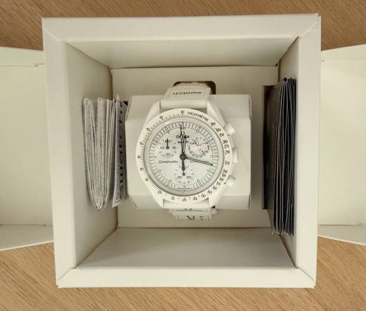 Swatch bioceramic moonswatch collection mission-to-the-moonphase All white with Snoopy accents In excellent condition and in original box and receipt...