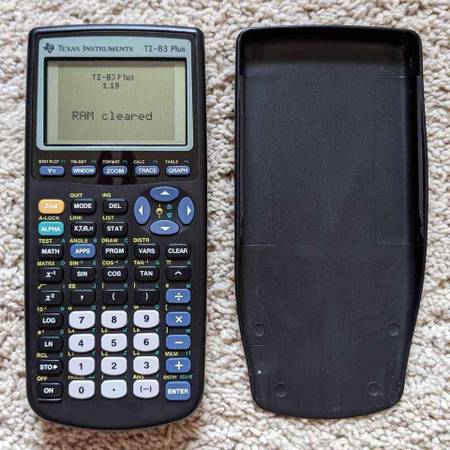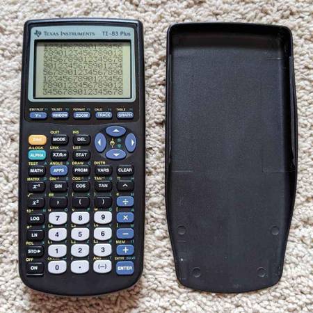 Selling a pre-owned TI 83 + monochrome graphing calculator in good cosmetic and working condition. Screen is completely intact and perfectly functional without any missing pixels. Comes with 4 AAA batteries and a protective sliding cover case.