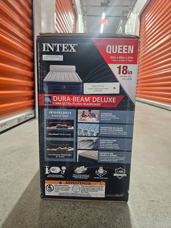 Brand New, the box was never opened. The Intex Dura-Beam Deluxe, ultra plush headboard, airbed features an 18" raised height, dual-layer comfort top , and Fiber-Tech construction for durability. It has a built-in electric pump for easy inflation and deflation. The queen-sized airbed measures 60" x 80" x 18" and has a 600-lb weight capacity . The unique edge construction provides stability, and the headboard offers back support and prevents pillows from slipping off. The airbed inflates and deflates in approximately 5 minutes, making it convenient for use at home or on the go. Please call Carmen @ show contact info