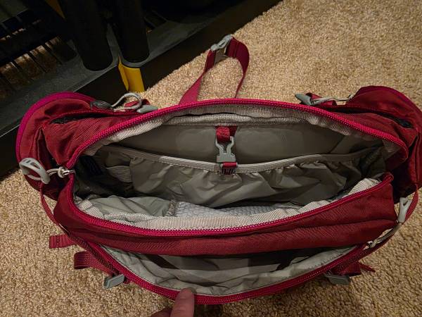 Storage: Offers a main zippered compartment with an internal reservoir sleeve, an easy-access front pocket with tool organization, and two zippered hipbelt pockets.