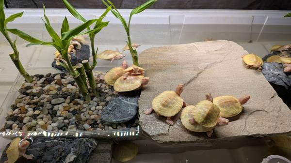 Red eared slider turtles Albino 2inch $80 Snow 1.5inch $100 Caramel pink $120 2inch text and pickup cash only Turtle reptiles diamondback terrapin snakes Arowana freshwater aquatic terrarium...