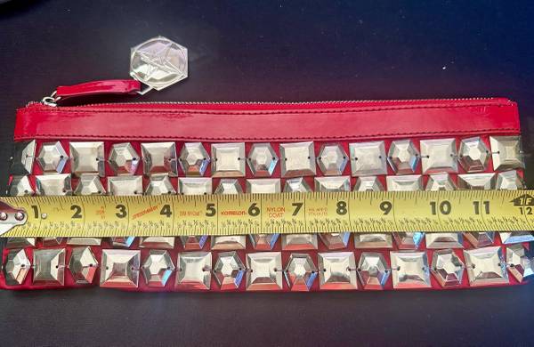 This is a "Forever Your Girl" by Paula Abdul red patent leather clutch with large silver studs. It has a heart charm on the zipper pull featuring the Paula Abdul logo and the words "Forever Your Girl" stitched inside the lining of the purse .