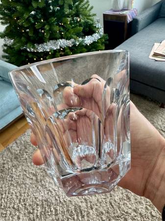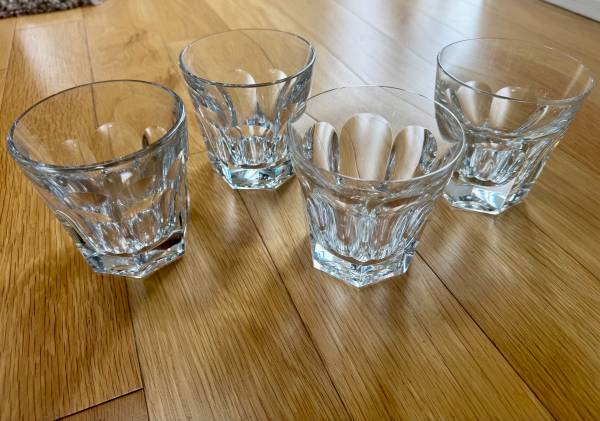 4 Baccarat Crystal Harcourt double old fashioned glasses, one with slight variation in design. All with appropriate markings. {Approximate dimensions: each 4" wide at mouth and 4 1/4"tall.}.