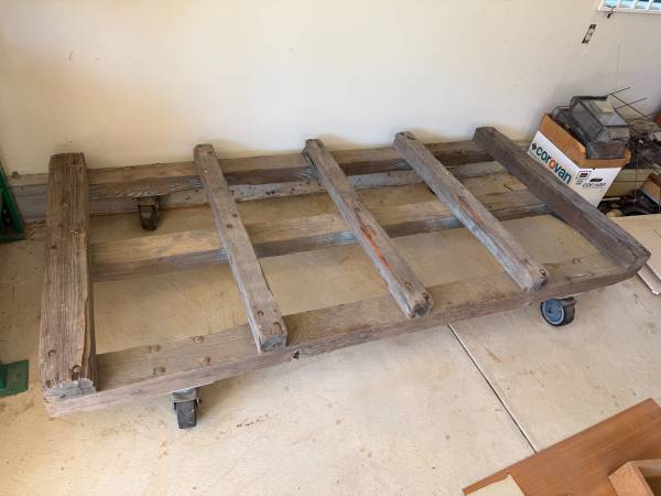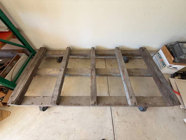 This is a very solid 4’ x 8’ pallet rack on casters made of thick wooden beams sitting on top of 4 large wheels. We used it to store sheets of plywood that could be rolled in and out of the...
