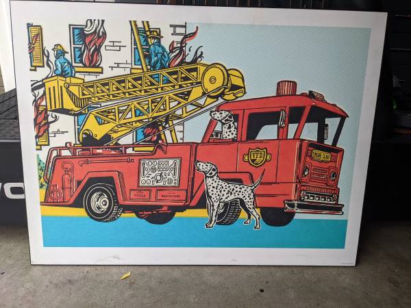 Unique wall hanging of a classic image of dalmatians and firemen in a comic-style print mounted on wood and professionally-wired to hang on the wall. Bright vivid colors. Painting Wall hanging Print...