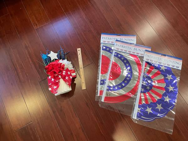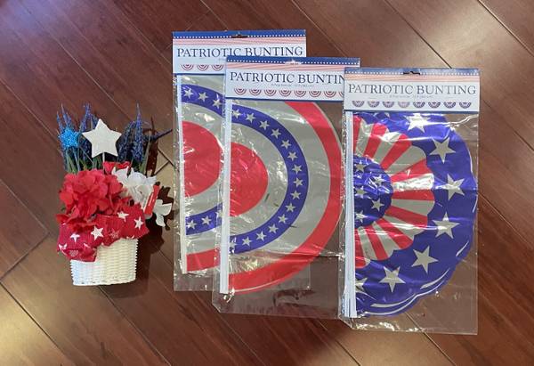 4. 3 Unopened shiny, water resistant, bunting banner of 8 flags - 12 ft each. Plastic foil. Sells on ebay and Amazon for $8 each: https://a.co/d/b75OkcR https://a.co/d/6ypfj3Z