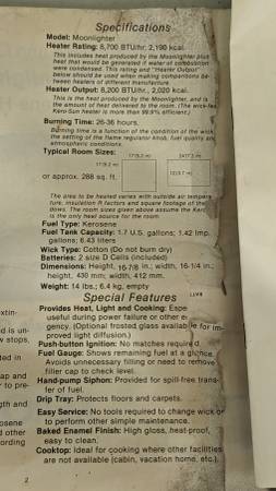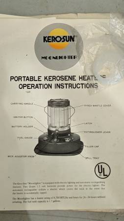 Vintage Kero-Sun Moonlighter Portable Kerosene Heater. Good condition, works fine. The battery starter does not work, lights with a lighter. With kerosene in the tank, ready to use. Includes instruction manual. Provides heat, light and a cooking surface, great for power outages, shop heating, patio heating, camping. Can be used indoors with proper ventilation and best if started and extinguished outside. Made in Japan.