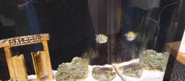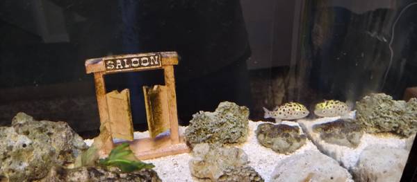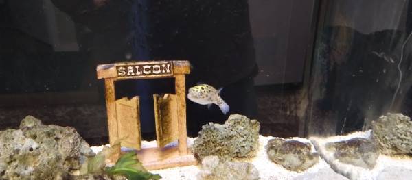 Medium sized green spotted puffer fish in saltwater conditions. Please message me for any questions.