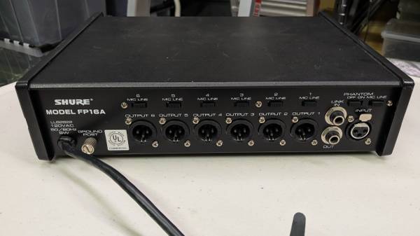 The Shure FP 16A is a portable 1 input 6 output distribution amplifier with a single XLR Input and 6 XLR Outputs. The input and outputs are capable of both Mic and Line level operation and 30 VDC Phantom Power (global switch). Link In/Out connections allow the FP16A to be cascaded when additional outputs are necessary. In addition to the compact design the FP16A can be AC or battery powered making it perfect for use in the field.