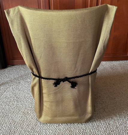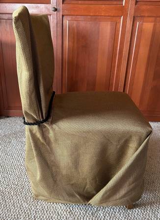 5 elegant gold dining chair slipcovers in beautiful heavy cotton twill fabric. Primarily gold color in a diagonal twill weave contrasted with a thinner black twill. They each come with a black cordings as shown in the picture which slip around the chairback for a designer accent. Machine washable. Original price $75 each.