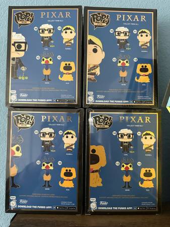 4 Pixar UP Funko POP pins. Carl, Russell, Kevin and Dug. Brand new never opened. Numbers 10, 11, 12 and 13. Dug is a limited edition Chase. The pins are each approx 3 1/2” to 4 1/2”. They are sealed in plastic. Asking $50 cash for all 4 of them and pick up is in South San Francisco.