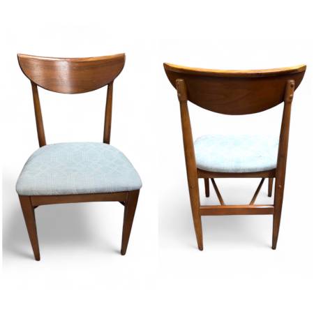 I love the cat eye shaped seat back design with a slight lip along the top back edge- reminiscent of the Danish design by Kurt Ostervig! The seat upholstery is a light blue color- clean with good foam- recently done in 2017.