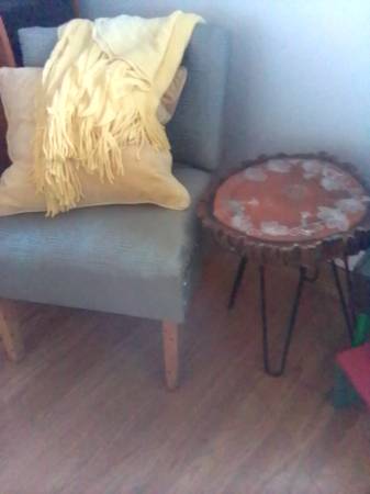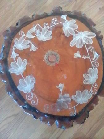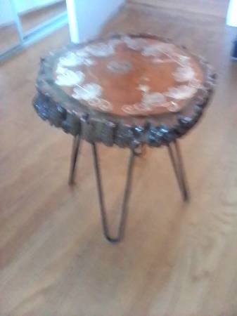 Epoxy Resin Redwood "Round" made into a side table with metal hairpin legs in black Top also features a silver flower Vine around the edge of the table. Sturdy. Works with many different styles. $50