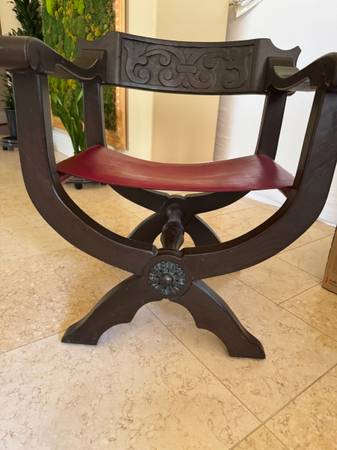 Great Italian accent chair with red leather seat and solid wood frame, it is called a Dante chair, that was purchased from local antique store.