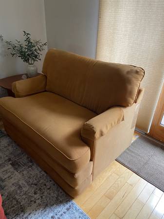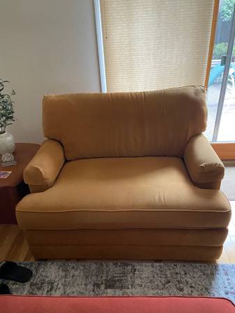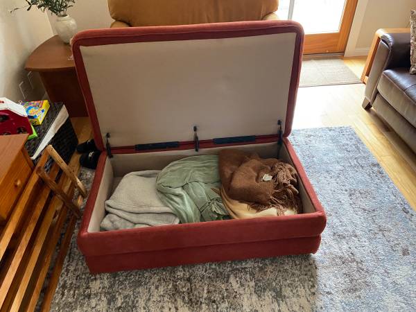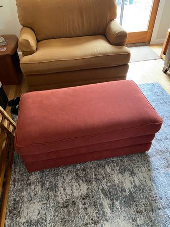 Upholstered couch, upholstered hide-a-bed love seat and upholstered ottoman with storage