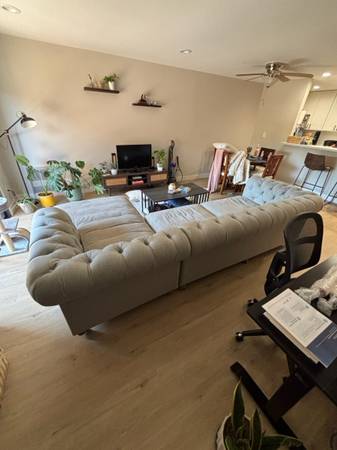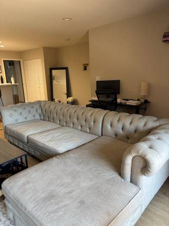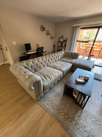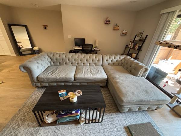 Light grey sectional fabric couch on wheels. Comes apart with washable cushions. Comes from a smoke free pet free house. Must pick up. No shipping or drop off
