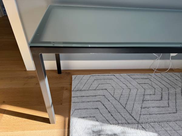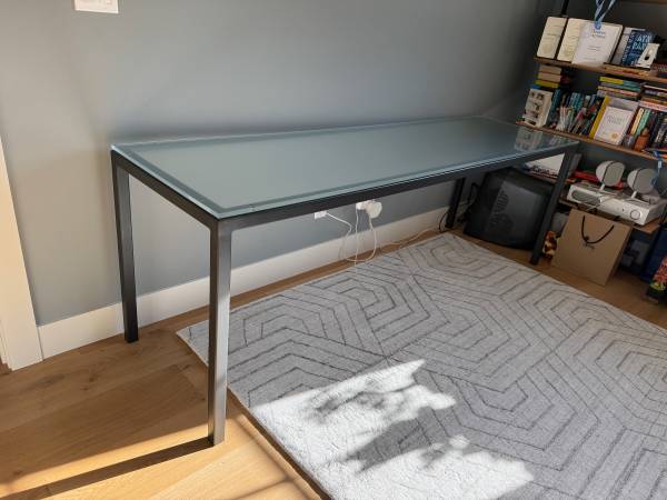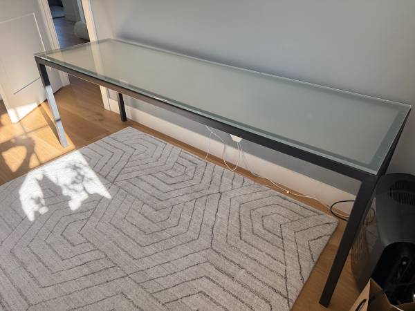 Room & Board Parsons Desk. 1.5" Natural Steel frame. Custom size is 84" wide by 24" Deep by 28" high (around 29" standard desk height with top). Top is Satin etched tempered glass.