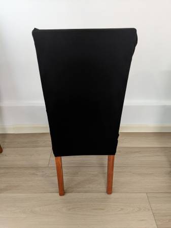 NO emails. Text Only ( Frank ) Wood Dining Chair Set with NEW Black Seat Covers ( the Last Pic with Dimensions is the Original without seat covers ) Non smoking Household, No tears, No Stains, No...