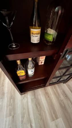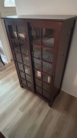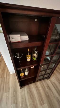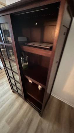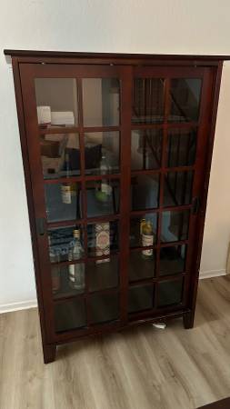 This posting is for a Solid wood sliding door china cabinet. The brand is by coaster furniture. We are currently moving into a smaller space and need to part ways with our beloved cabinet. We used it as a liquor cabinet and to store fine crystal wear. Each shelf has a hole through the back in case someone wants to put LED lighting throughout which we did. The color is a solid, dark mahogany. The piece is very heavy as it is solid wood.