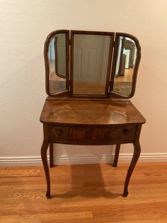 This little dressing table was my grandmother’s and could easily fit in her small bedroom. The chair is small, almost child size, but perfect for the table. The table has a single, full-width drawer with dovetailing. The side mirrors can move to make it easy to see your face from different angles. The set is unique and a definite antique from the early 1900s. I suppose it is oak but don’t know for sure. The table is 53” high, 30” wide and 18.75” deep. Add an inch to each side if the mirror is flat. The little chair is 29” high, 18” from floor to seat. The seat is 15” at the front and 13” at the back. The table top shows some wear (character?) as does the chair seat, but they should be easy to renew if desired. I think it looks fine the way it is. $180. Cash only please.